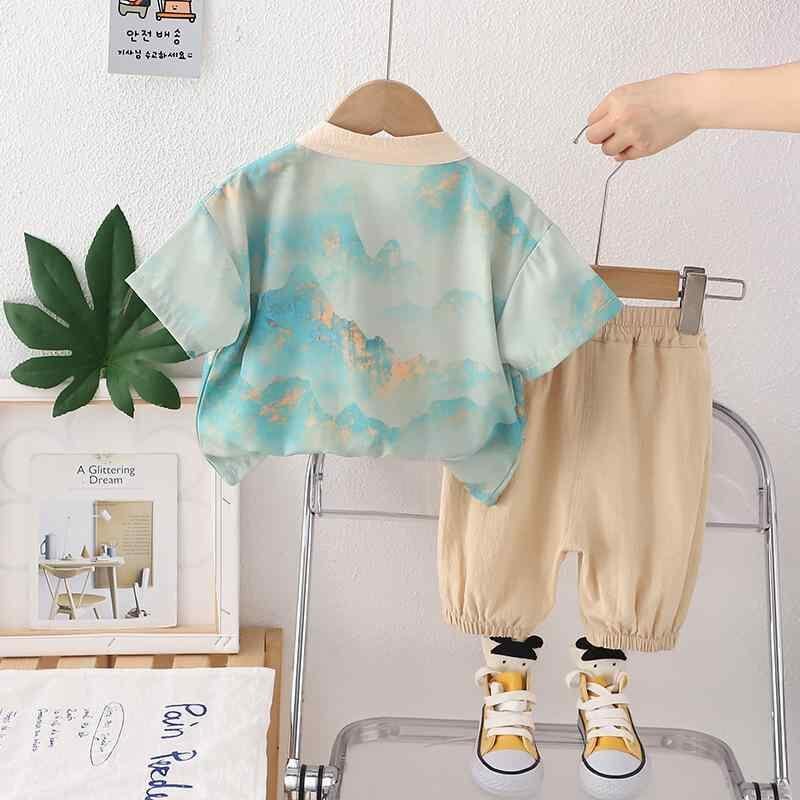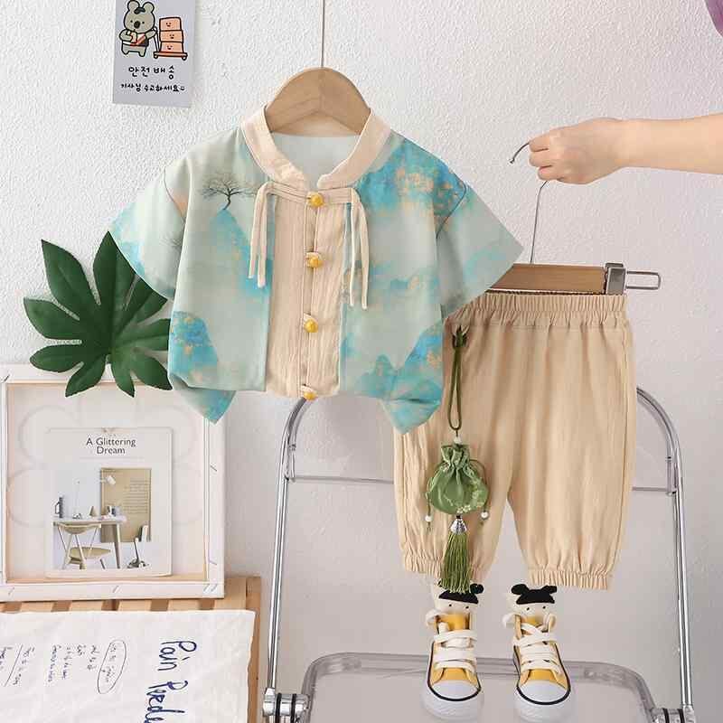ベビー服 男の子 新中華風 漢服 唐装 上下セット 一歳 誕生日 お祝い フォーマル 半袖 ショートパンツ 綿素材 夏用 薄手 緑