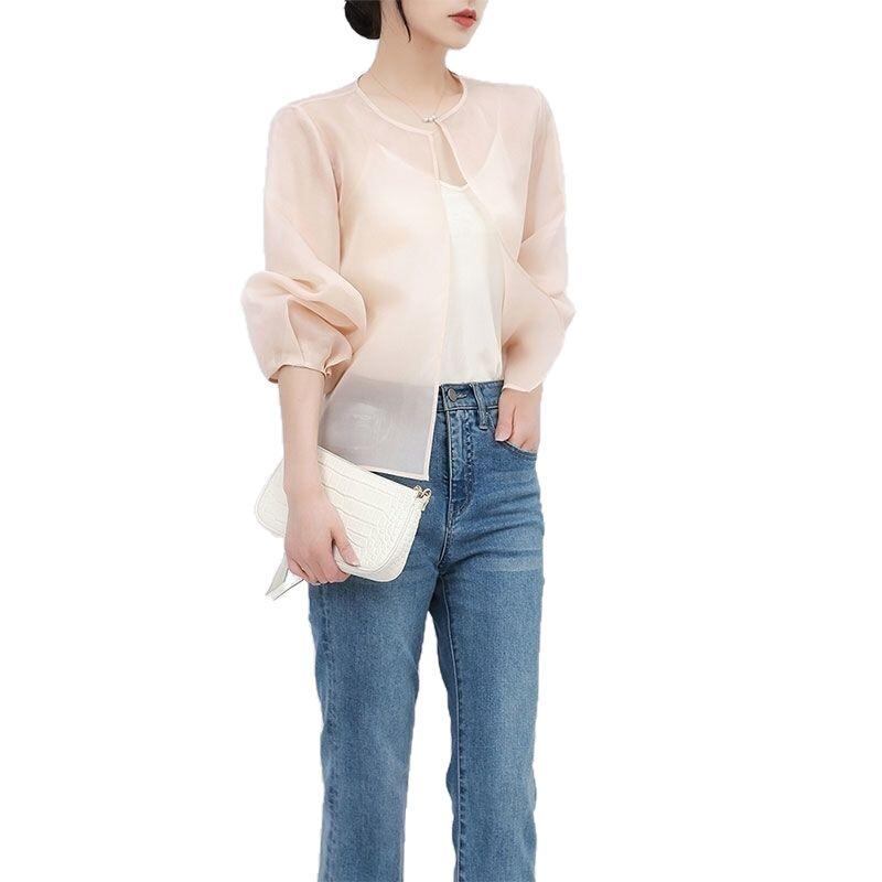 カーディガン レディース Vネック 7分袖 軽量 薄手 シアー 透け感 冷房対策 シフォン ポリエステル 羽織り トップス オフィス カジュアル デイリーユース ホワイト アプリコット