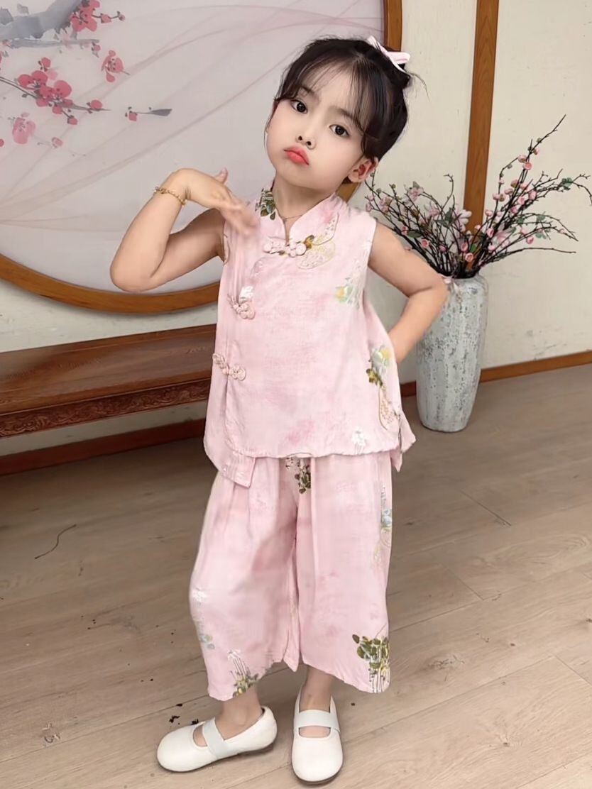 セットアップ ガールズ 夏 中華風 ノースリーブ トップス 七分丈パンツ 上下セット プリンセス風 ポリエステル 綿混 柔らか素材 ピンク かわいい