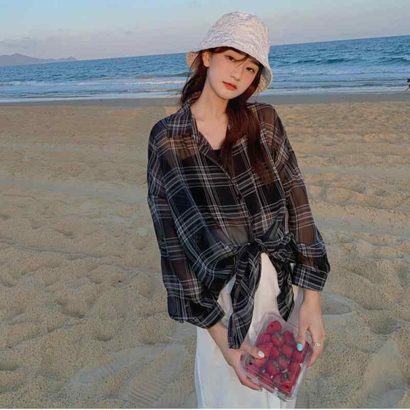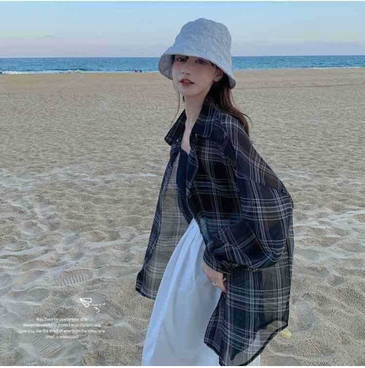 シャツ レディース チェック柄 ポロ襟 長袖 薄手 シースルー 透け感 接触冷感 UVカット 日焼け対策 ゆったり カーディガン シャツアウター 羽織り 大人カジュアル きれいめ 上品 普段使い オフィス カジュアル 夏用