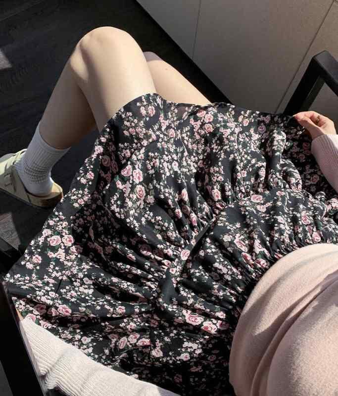 スカート レディース 黒地ピンク 小花柄 ティアードスカート Aライン ショート丈 ミニ丈 韓国風 小柄向け 刺繍 レース 伸縮性 ポリエステル ポリウレタン フェミニン かわいい