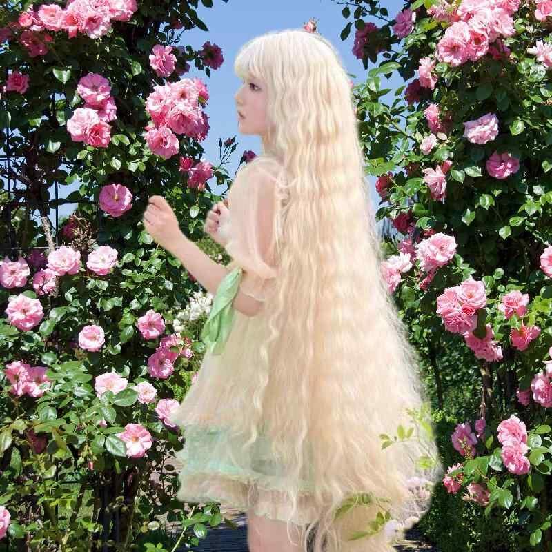 ウィッグ レディース 女性用 超ロング 100cm ライトゴールド 淡金色 羊毛巻き 巻き髪 カール ロリータ コスプレ アニメ イベント 耐熱 フルウィッグ 自然 リアル パーマ可能 染め可能