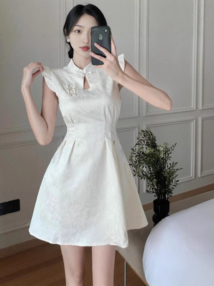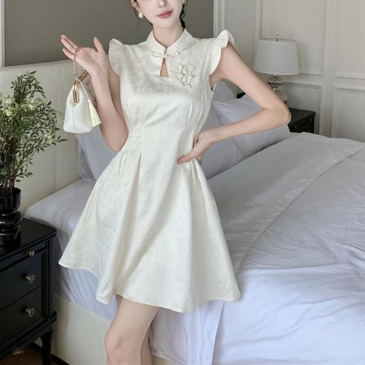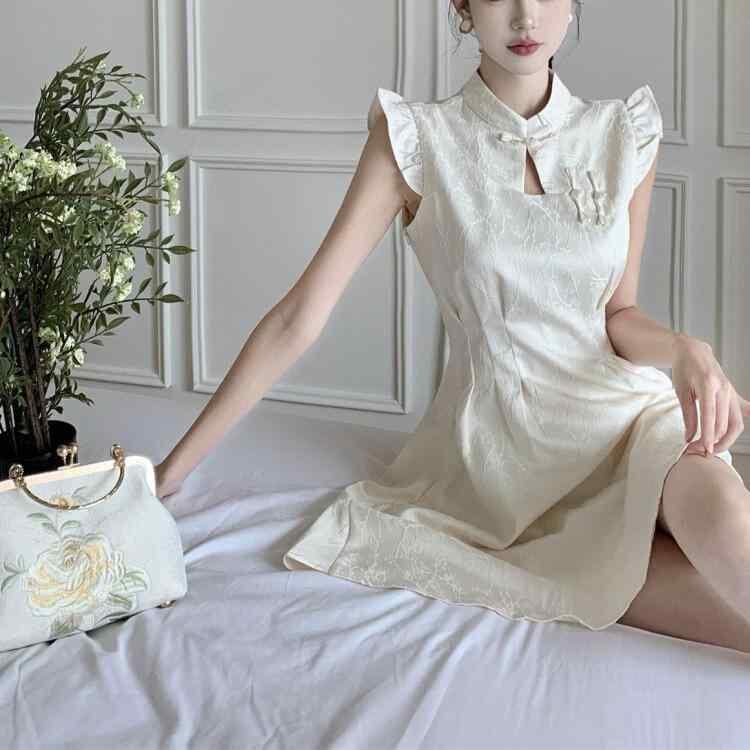 ワンピース レディース エレガント 上品 夏 フリル袖 チャイナ風 改良版 高級感 チャイナドレス ショート丈 Aライン ハイウエスト スタンドカラー ポリエステル エンボス加工 レトロ アプリコット