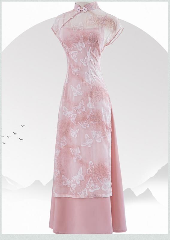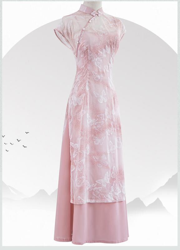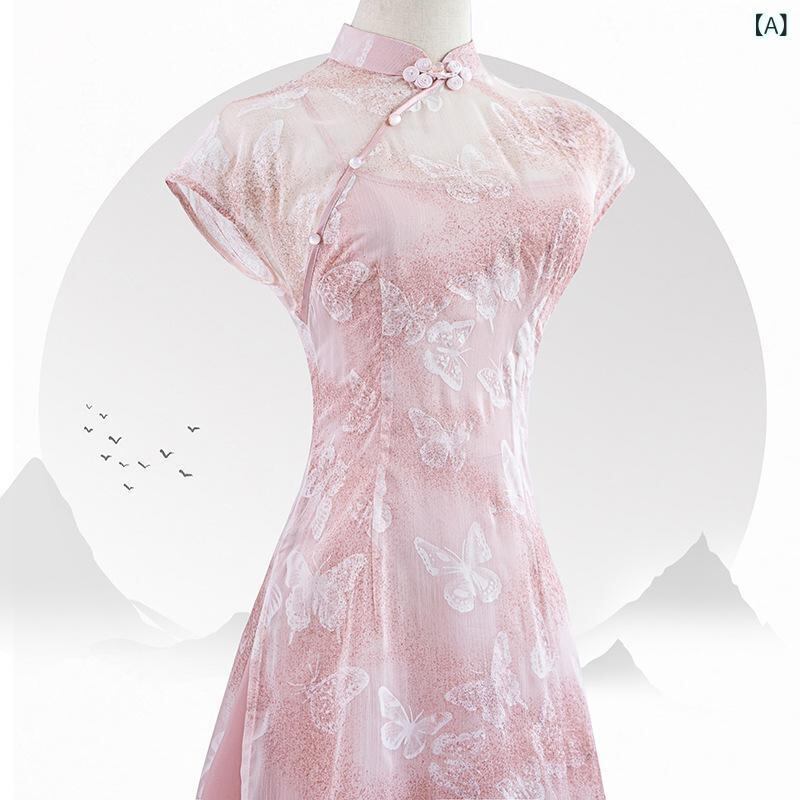 ワンピース レディース 改良型 チャイナドレス チーパオ風 ロング丈 スタンドカラー 斜め合わせ 3分袖 シフォン素材 ストレッチ 普段使い デイリー 小柄向け 低身長対応 高級感 ピンク エレガント 清楚系 フェミニン スウィート