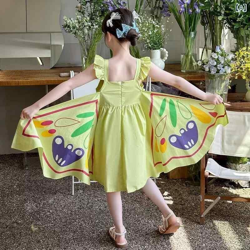 ワンピース キッズ 女の子 ベビー 小学生向け かわいい 蝶々柄 プリンセスライン キャミソールワンピース 夏物 綿素材 柔らかな肌触り 普段使い お出かけ 通園 おしゃれ カジュアルスタイル ピンク 黄緑
