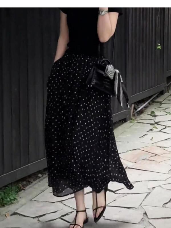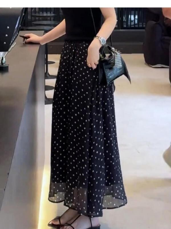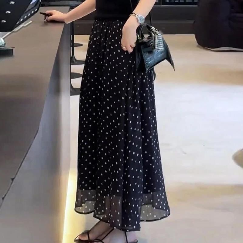 ・カテゴリ: スカート・主な素材: アイスシルク、レーヨン・柄: ドット柄・加工: プリント・シルエット: Aライン・スカート丈: ミディ丈・スタイル: きれいめカジュアル、アーバン、フェミニン・カラー: ブラック・サイズ展開: M、L、XL、2XL、3XL、4XL