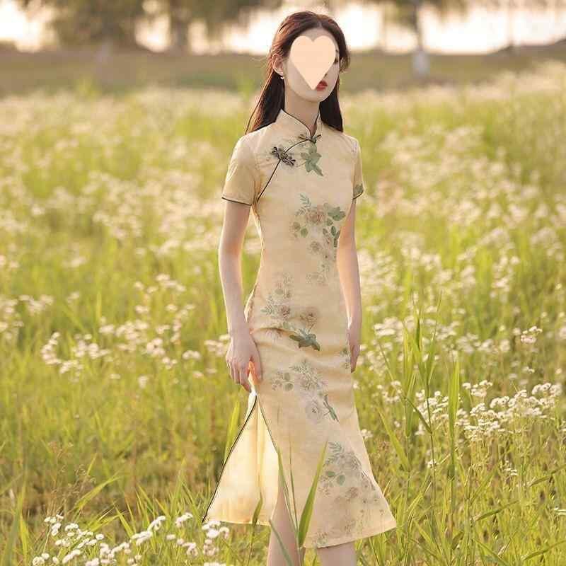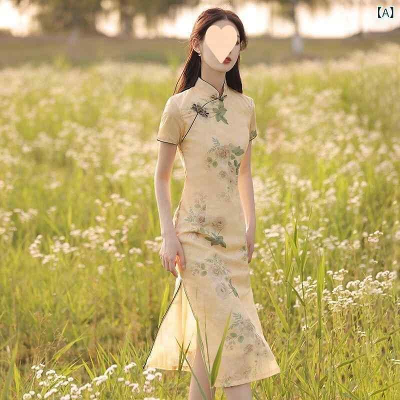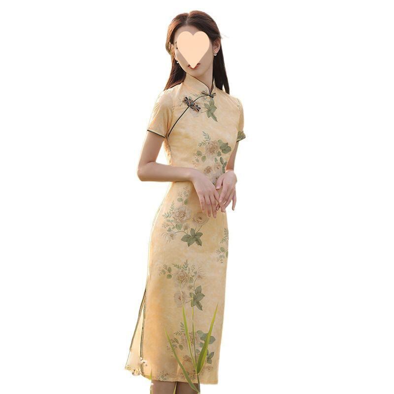 チャイナドレス レディース 黄色 着痩せ 細見え効果 スタイルアップ ロング丈 レトロ ヴィンテージ エレガント 上品 中国風 夏