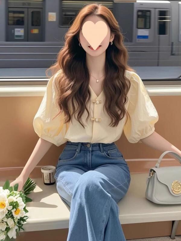 ブラウス レディース 新チャイナスタイル 半袖 アプリコットカラー 夏 ライトラグジュアリー 優しい気品 フレンチスタイル パフスリーブ チャイナボタン