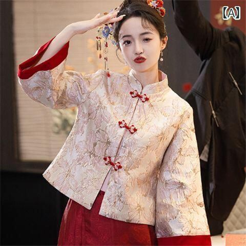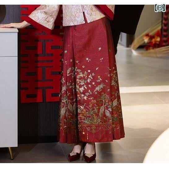 ドレス セットアップ レディース 大きいサイズ 新中式 馬面裙 トップス スカート 結婚式 披露宴 新婦用 フォーマル Aライン オフショルダー 長袖 パフスリーブ ミモレ丈 シェニールストレッチ シャンパンピンク レッド