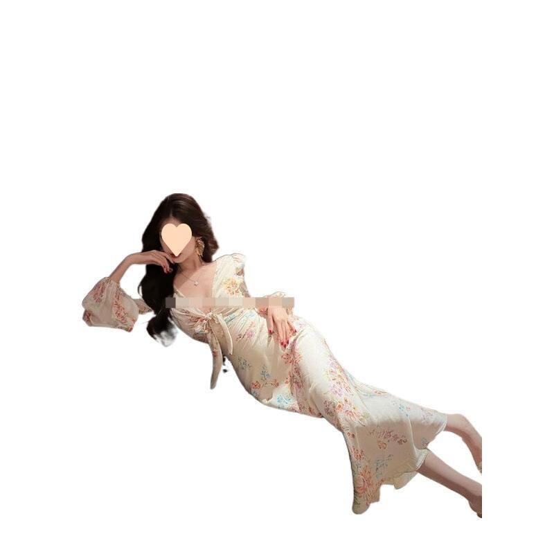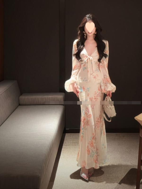 ワンピース レディース 大きいサイズ プラスサイズ Vネック 長袖 プリント ウエストマーク マーメイド ロング丈 フレンチスタイル エレガント 大人セクシー 上品 体型カバー ゆったり