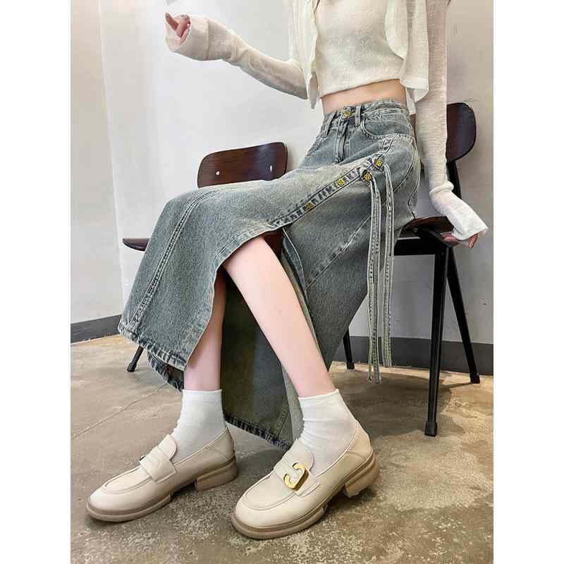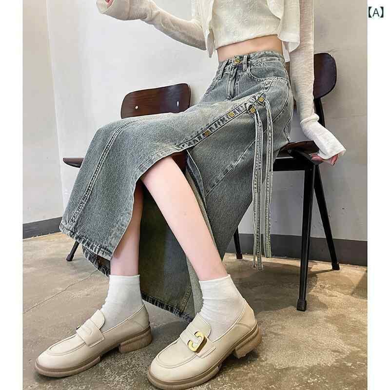 デニムスカート ハイウエスト スリット Aライン ミディ丈 大きいサイズ ゆったり 細見え 着痩せ効果 着回し 薄手 コットン 綿 きれいめ 通勤 オフィス ブルー ホワイト