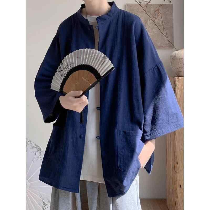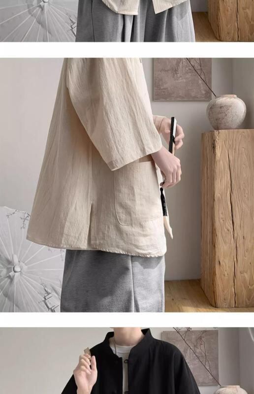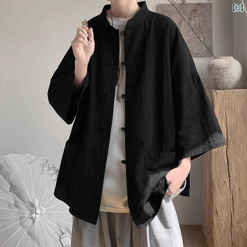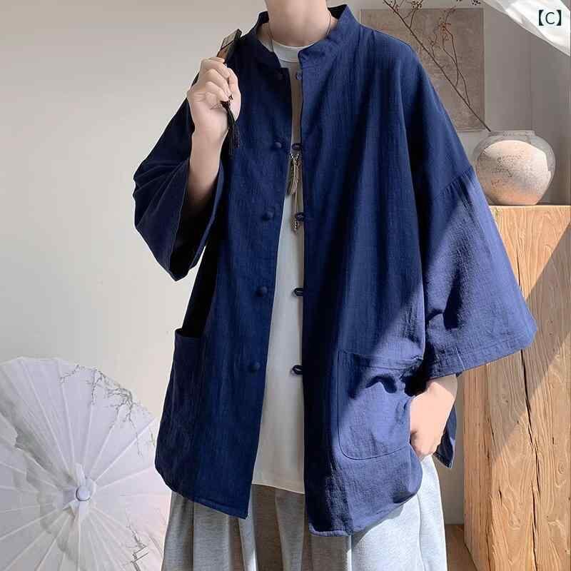 シャツ メンズ 新チャイナ風 唐装 七分袖 夏用 薄手 リネン 麻混 ゆったり 大きいサイズ スタンドカラー 通気性 ストレッチ ポケット付き カジュアルスタイル