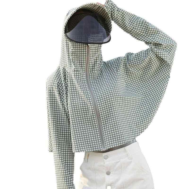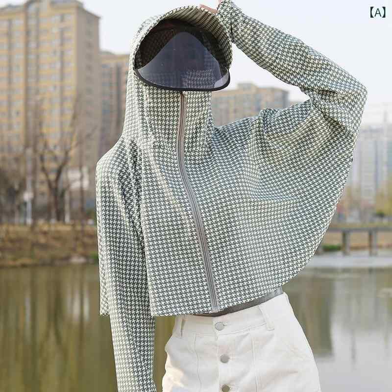 ・主な素材: ポリエステル 95%以上・スタイル: カジュアル、日韓風・シルエット: ケープ型・着丈: ショート丈(約40~50cm)・袖丈: 長袖・前開き: ジップアップ・厚さ: 薄手・柄: 千鳥格子、チェック柄・カラー展開: グリーン、ブルー、オレンジ、ピンク・サイズ展開: フリーサイズ(45~70kg向け)・紫外線防止指数: UPF50+
