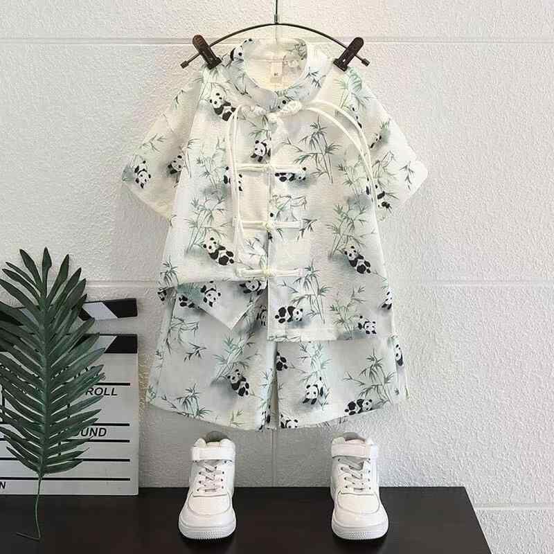 漢服 キッズ 男の子 夏 上下セット 中国風 唐装 古風 半袖 ショートパンツ ツーピース ポリエステル混紡 動物柄 カジュアル