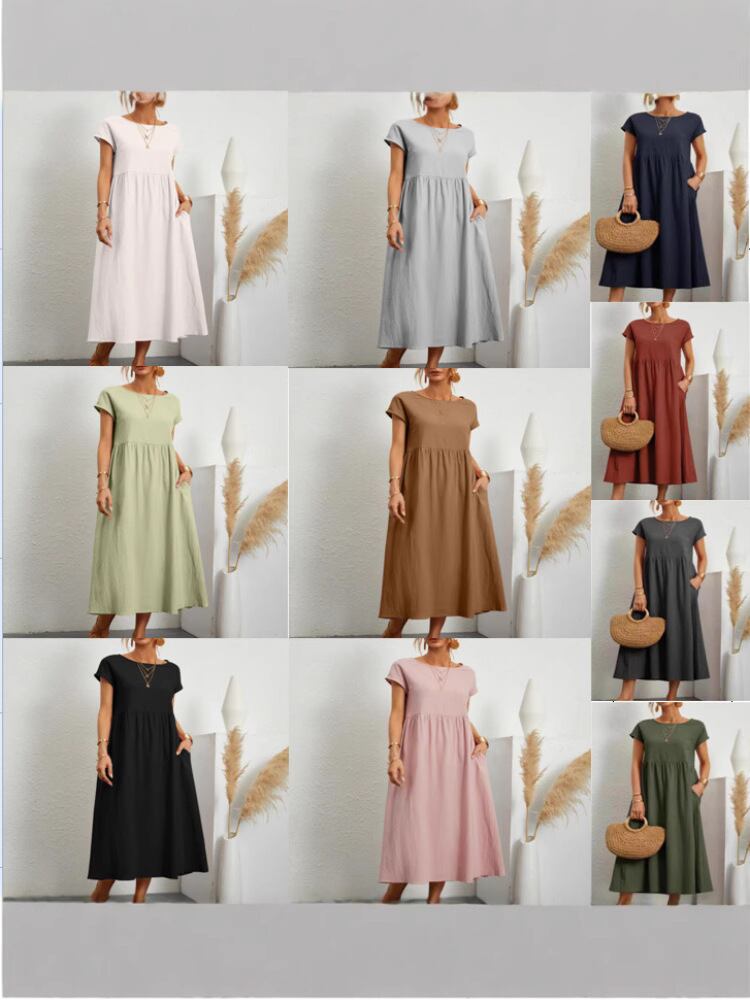 ワンピース レディース ノースリーブ ゆったり リラックスフィット ロング丈 無地 ポケット付き 綿麻 コットンリネン Aライン クルーネック ミドルウエスト 大きいサイズ 体型カバー カジュアル ナチュラル 普段使い 快適