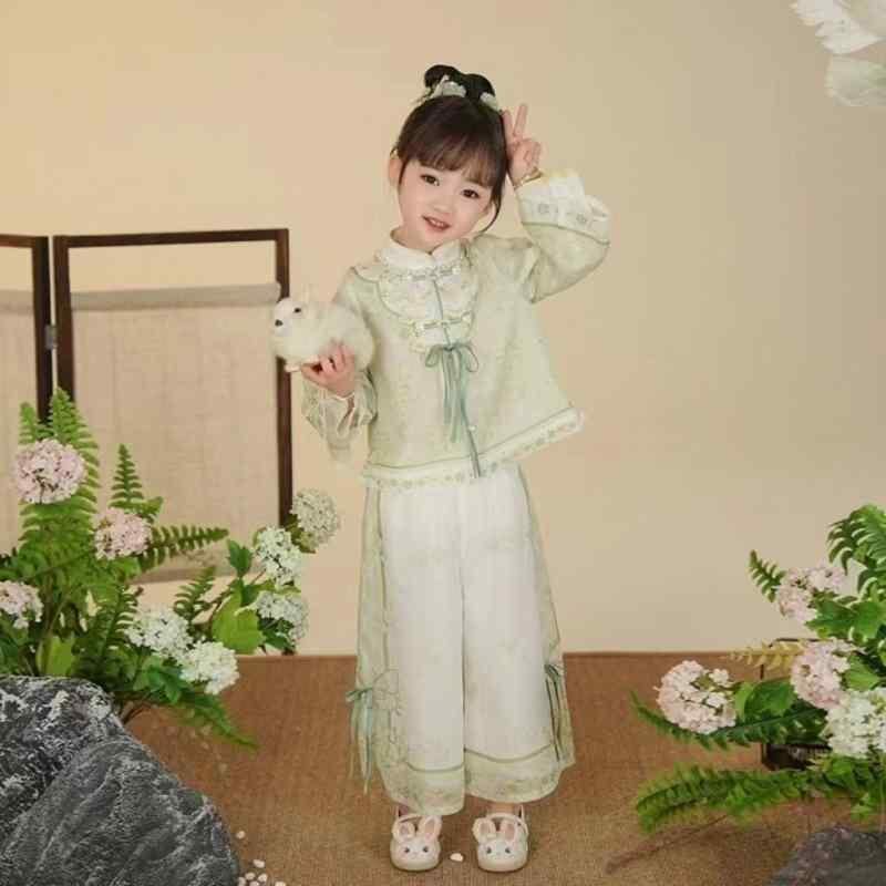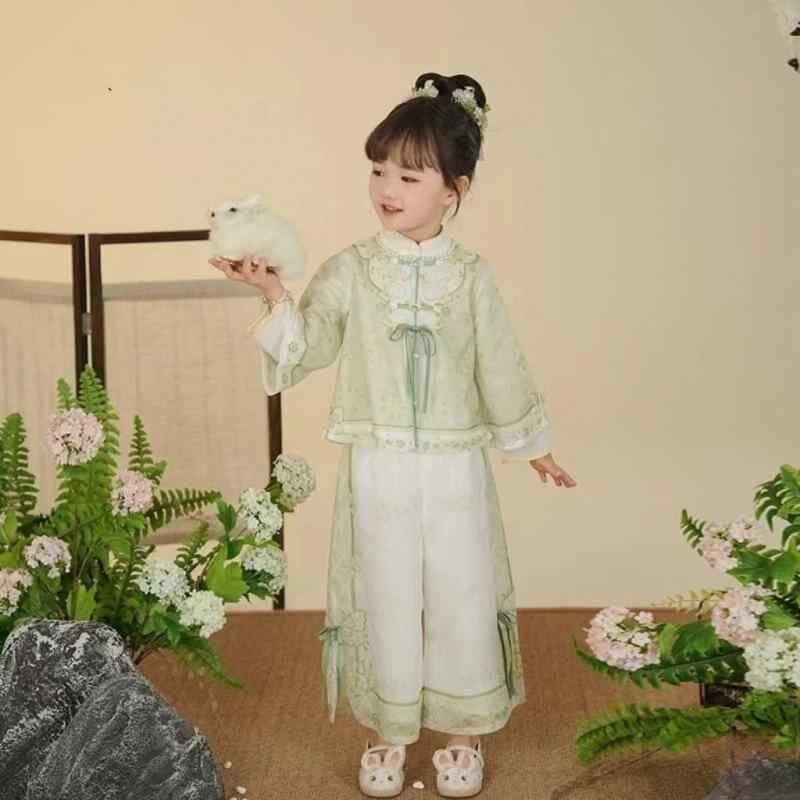 漢服 子供 女の子 夏服 唐装 民族衣装 中大童向け セットアップ レトロ 中国風 イベント衣装 シフォン ポリエステル 再生繊維 グリーン 蝶々柄 かわいい 普段使い お出かけ 上下セット
