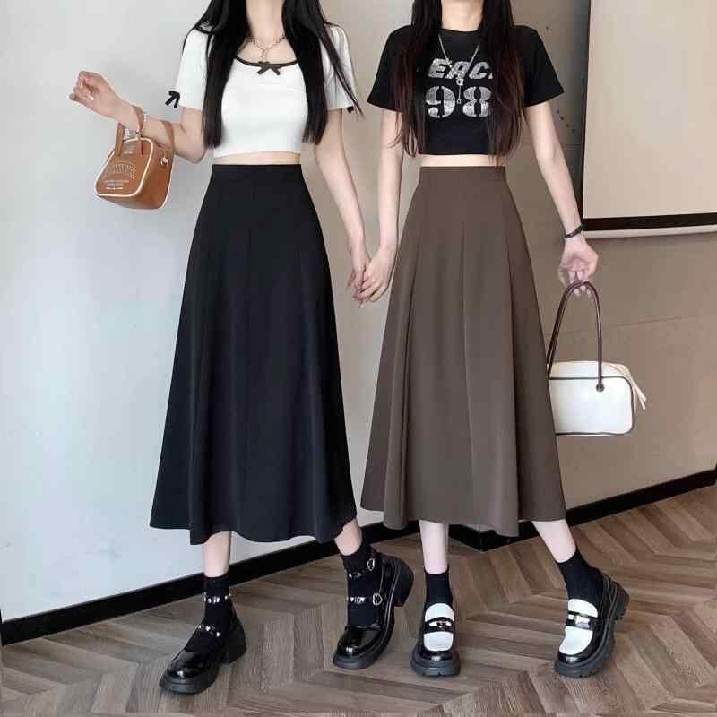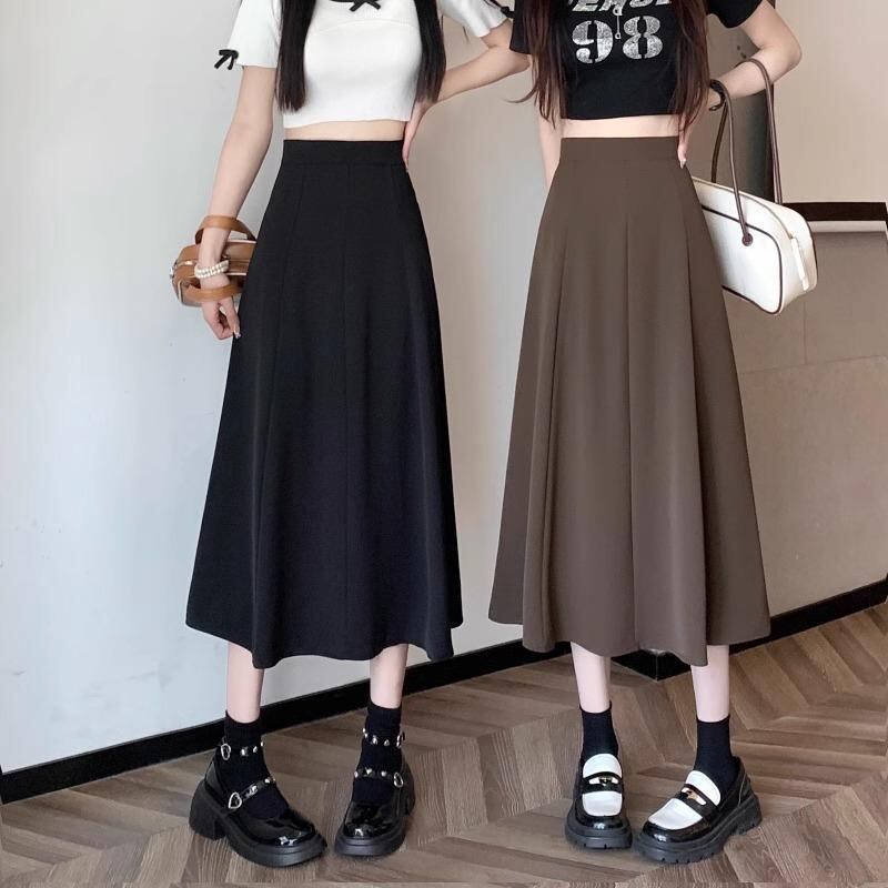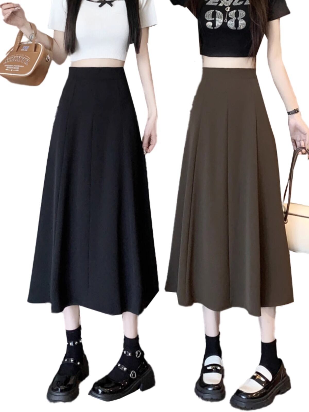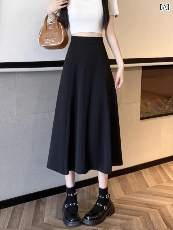 スカート レディース ハイウエスト ウエストゴム ミドル丈 Aライン フレア プリーツスカート ドレープ感 細見え 低身長向け きれいめカジュアル ブラック アプリコット