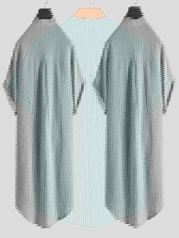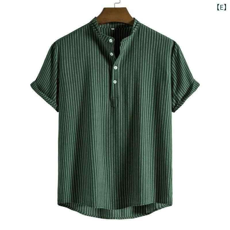 シャツ メンズ 夏 半袖 綿麻 スタンドカラー ビッグサイズ ゆったり ルーズフィット 薄手 軽量 通気性 ストライプ柄 ウォッシャブル トップス カジュアル 普段着