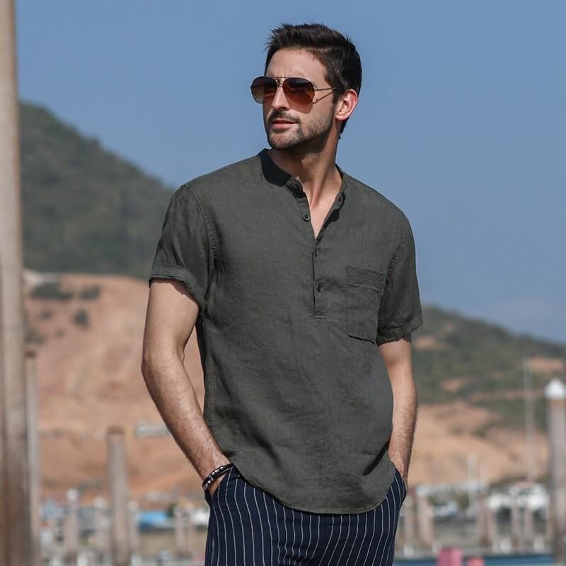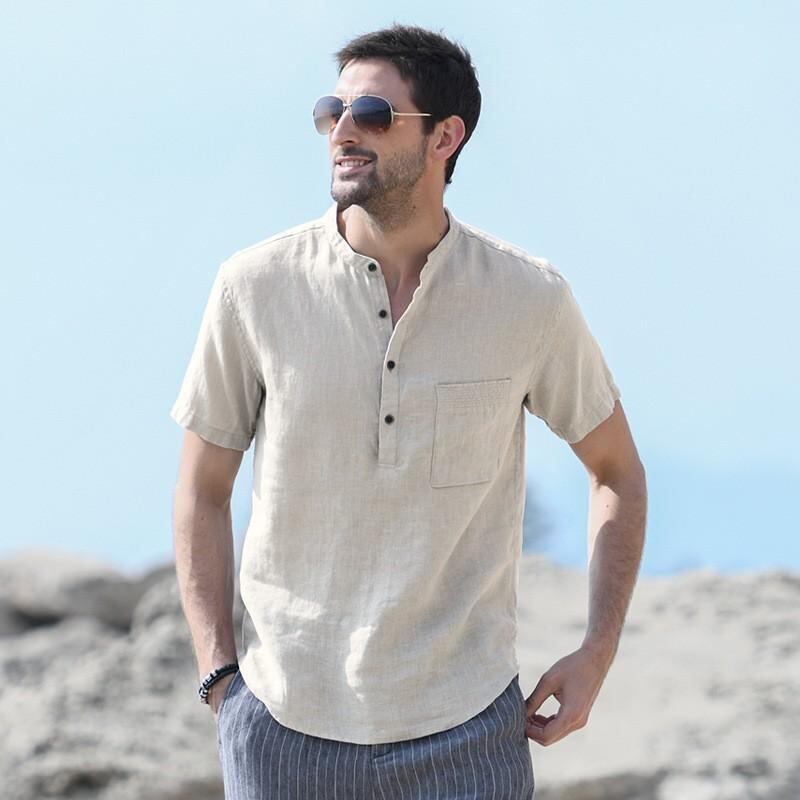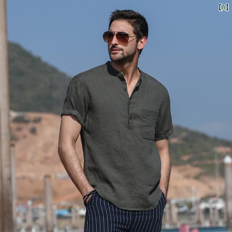 ・カテゴリ: シャツ・スタイル: 欧米風シンプル・性別: メンズ・対象年齢: 大人・適用シーズン: 夏・主な素材: リネン96%以上・生地番手: 20番手・厚さ: 薄手・機能: 洗濯機洗い可、アイロン不要・ネックライン: スタンドカラー・袖丈: 半袖・柄: 無地・デザイン: プルオーバー・シルエット: ゆったり・デザイン詳細: プリント・加工: ウォッシュ加工・適用シーン: 日常使い・カラー展開: グリーン、カーキ、オフホワイト・サイズ展開: M、L、XL、XXL、3XL