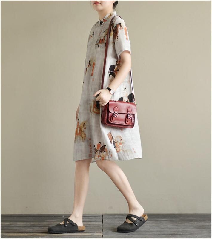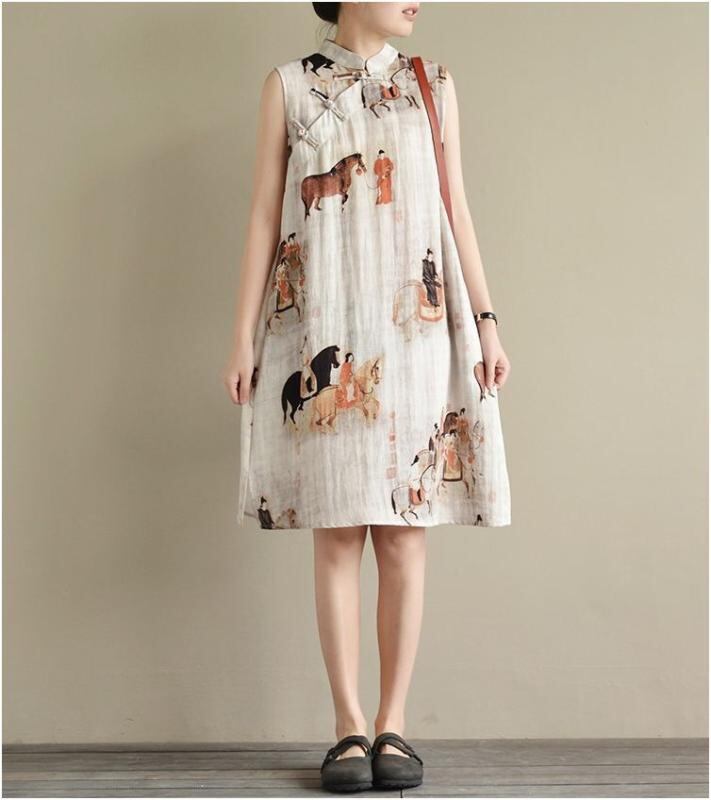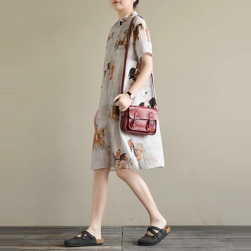 ワンピース 改良旗袍風 レトロ ヴィンテージ チャイナドレス風 チャイナボタン 綿麻 長袖 ゆったり ミモレ丈 Aライン スタンドカラー 切り替え 花柄 普段使い