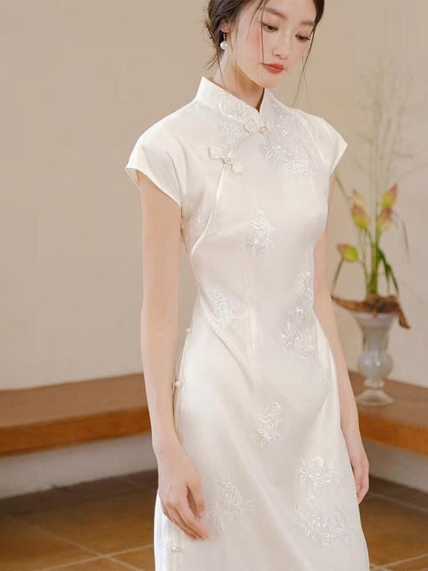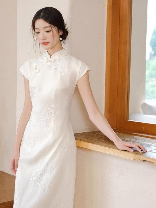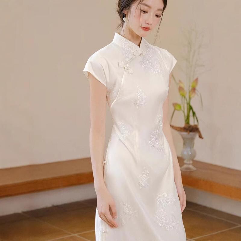 ワンピース レディース ノースリーブ チャイナドレス 中国風 改良デザイン レース シアー素材 ミディ丈 スリムフィット スタンドカラー エレガント 上品 フェミニン ホワイト ポリエステル 夏