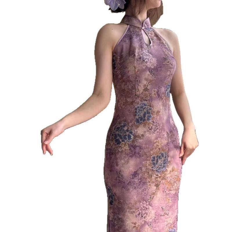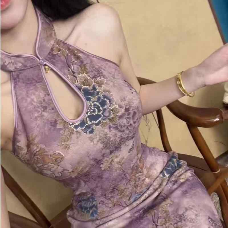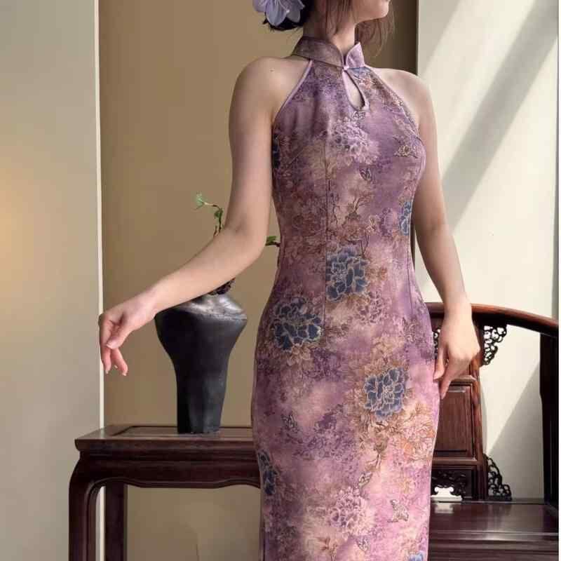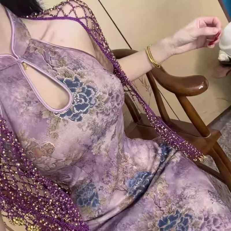 チャイナドレス レディース 新チャイナ エレガント カットアウトショルダー ティアドロップネック 金箔花柄 パープル ロング丈