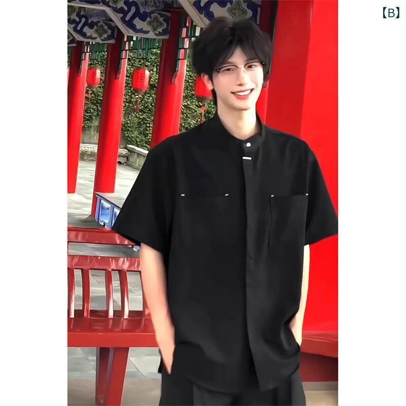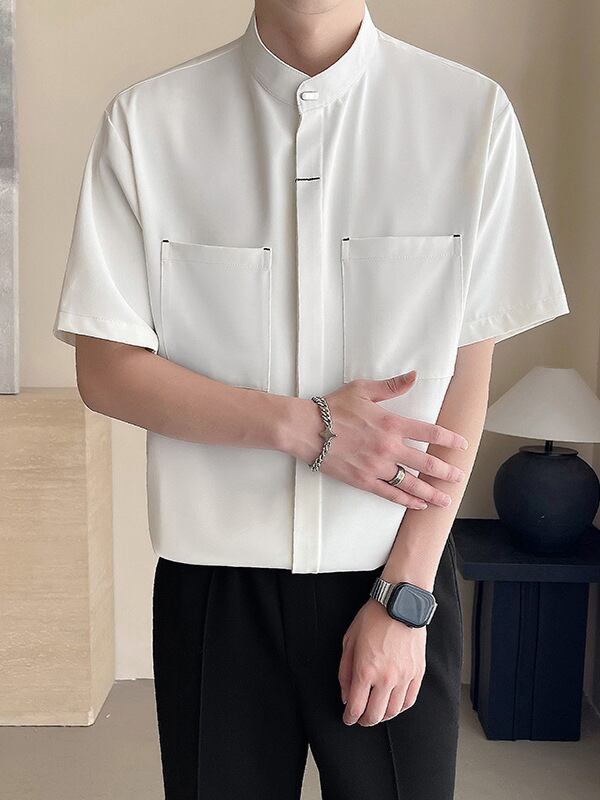 シャツ メンズ 男性用 半袖 接触冷感 スタンドカラー マオカラー 隠しボタン 比翼仕立て 中華風 ゆったり ポリエステル混紡 ノーアイロン シワになりにくい 普段使い デイリーユース ホワイト ブラック