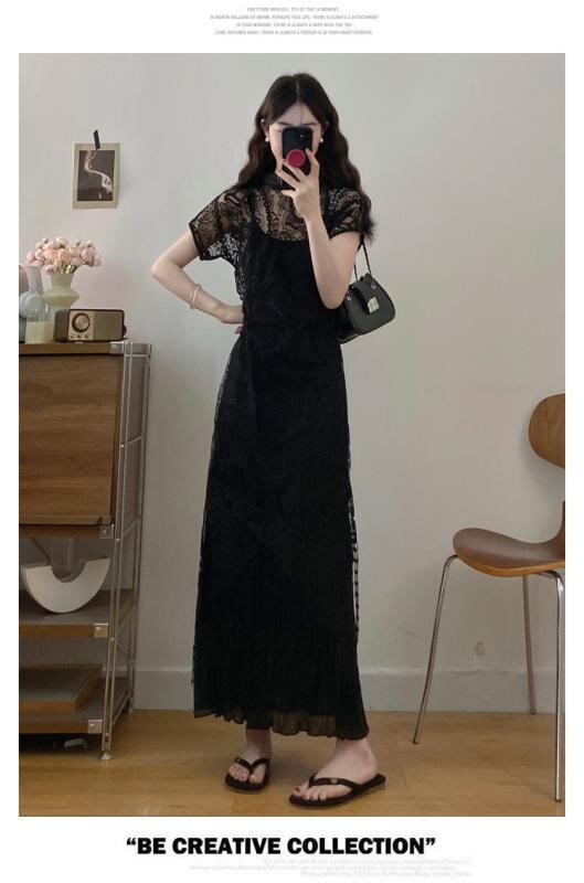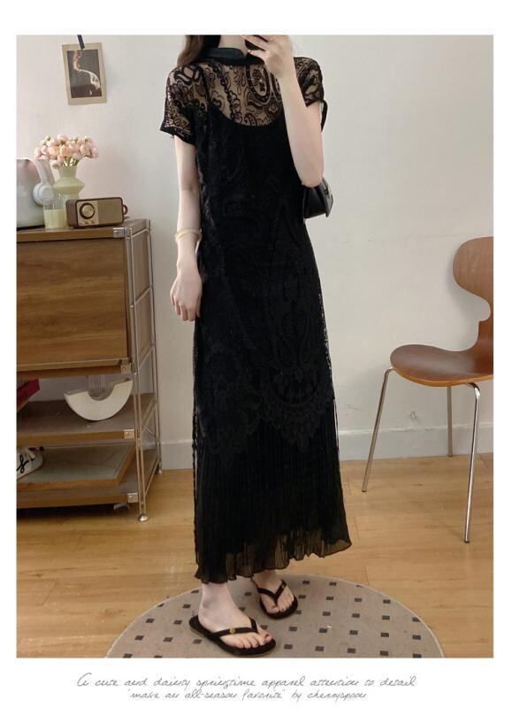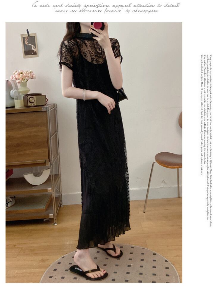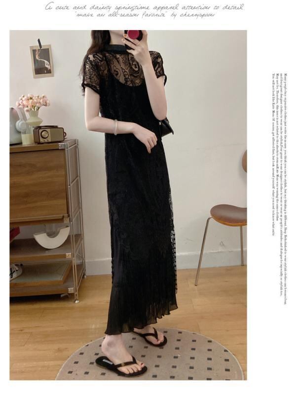 ワンピース レディース 大きいサイズ ツーピース 旗袍風 レース フリンジ 切り替え フレンチ エレガント 上品 ブラック ロング丈 スタンドカラー 半袖 ポリエステル ミドルウエスト お呼ばれ フォーマル