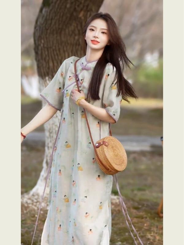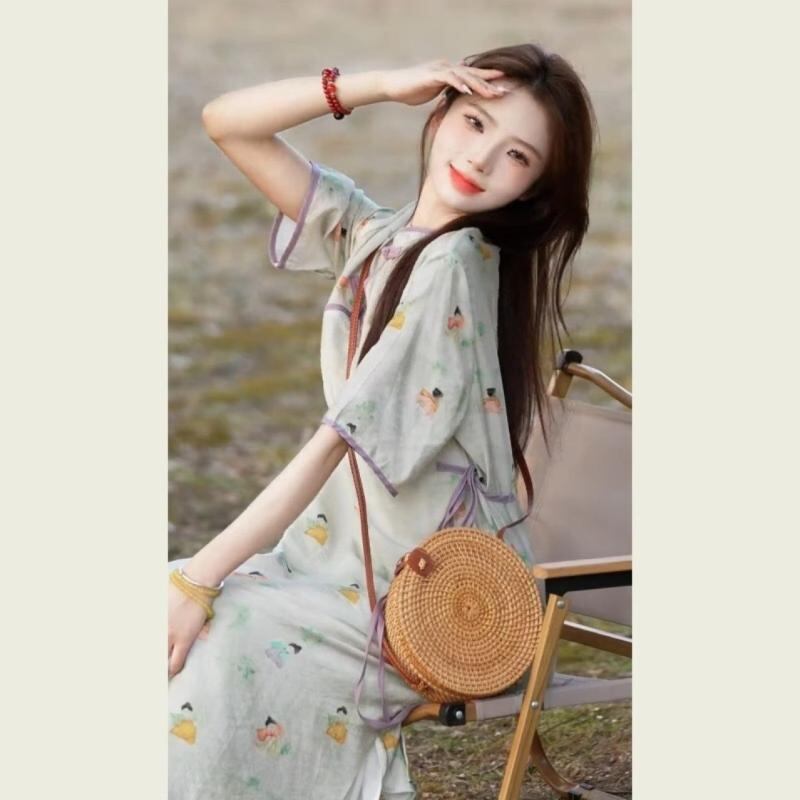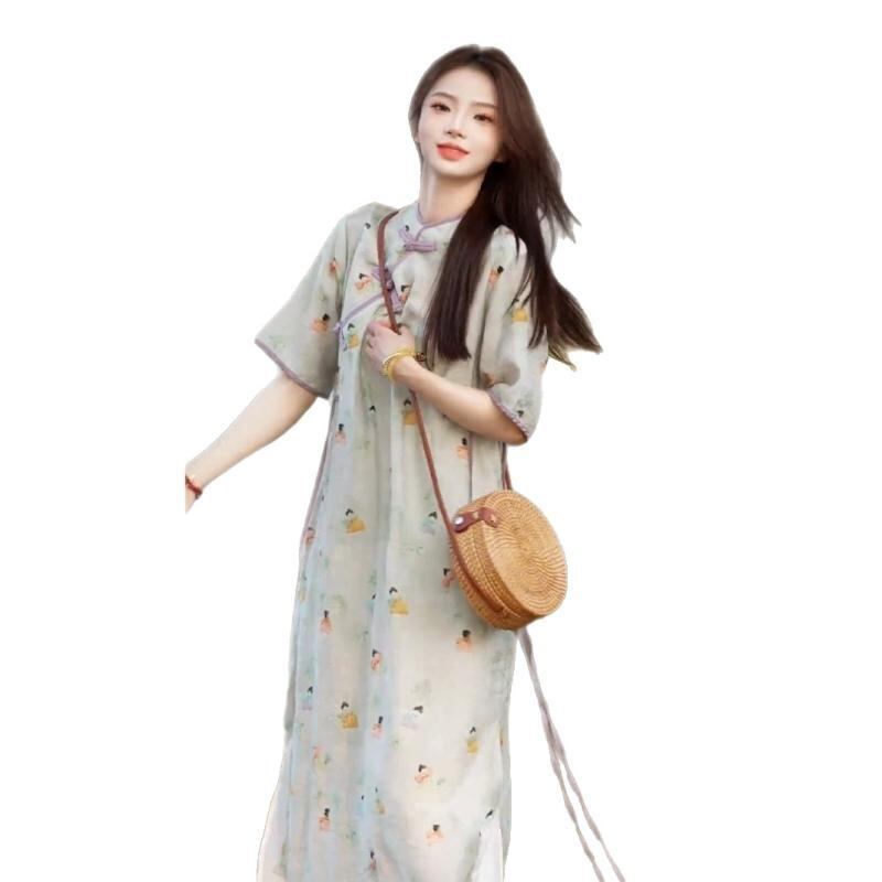 ワンピース レディース 大きいサイズ ゆったり 中華風モダン 改良チャイナドレス風 古風 レトロ エスニック調 綿麻 コットンリネン 天然素材 ミドル丈 ロング丈 印花柄 プリント スタンドカラー フリル袖 カジュアル リラックスウェア 普段使い 夏