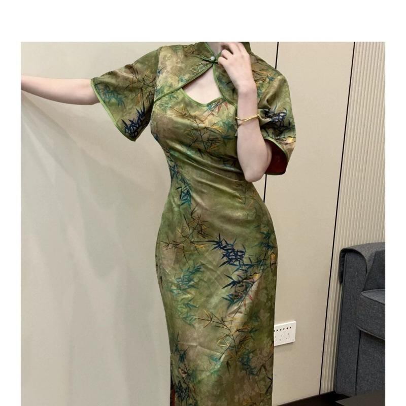 ・カテゴリ: チャイナドレス・スタイル: 都市風、通勤向け・主な素材: ポリエステル95%以上・ネックライン: ホルターネック・襟の形状: 斜め前開き・袖丈: 五分袖・袖タイプ: フリルスリーブ・丈: ロング丈・カラー展開: 一尧丹青・サイズ展開: L、XL、2XL、3XL、4XL・対象年齢: 成人・性別: 女性