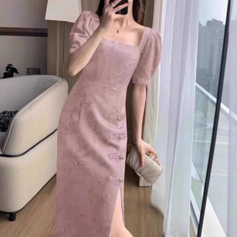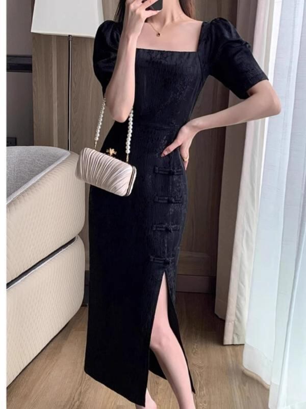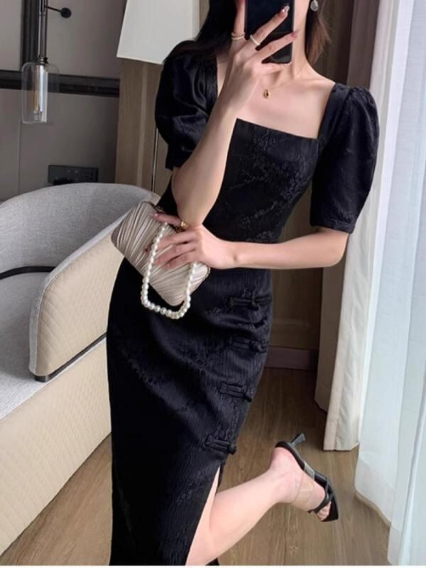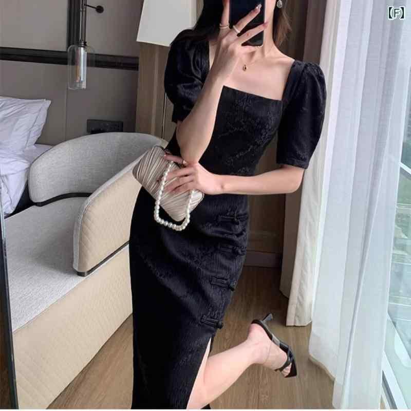 ワンピース レディース 大きいサイズ ふくよか 新中華風 チャイナドレス風 高級感 細見え効果 ジャカード織り 上品 エレガント 丸首 半袖 スリット ロング丈 Aライン ポリエステル