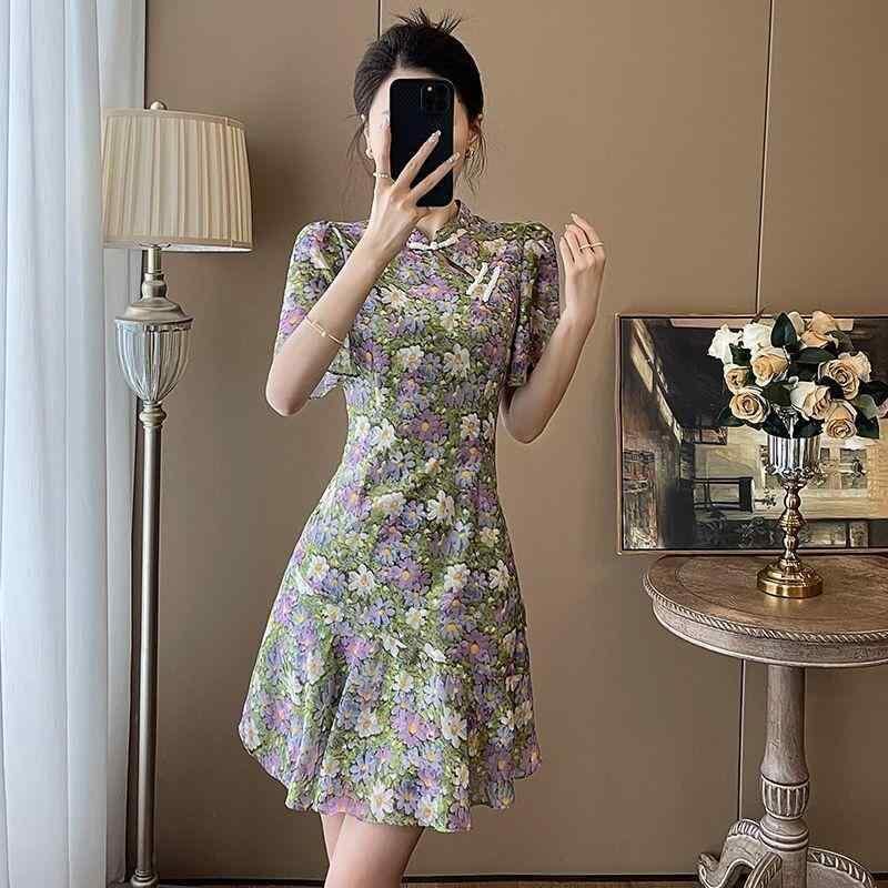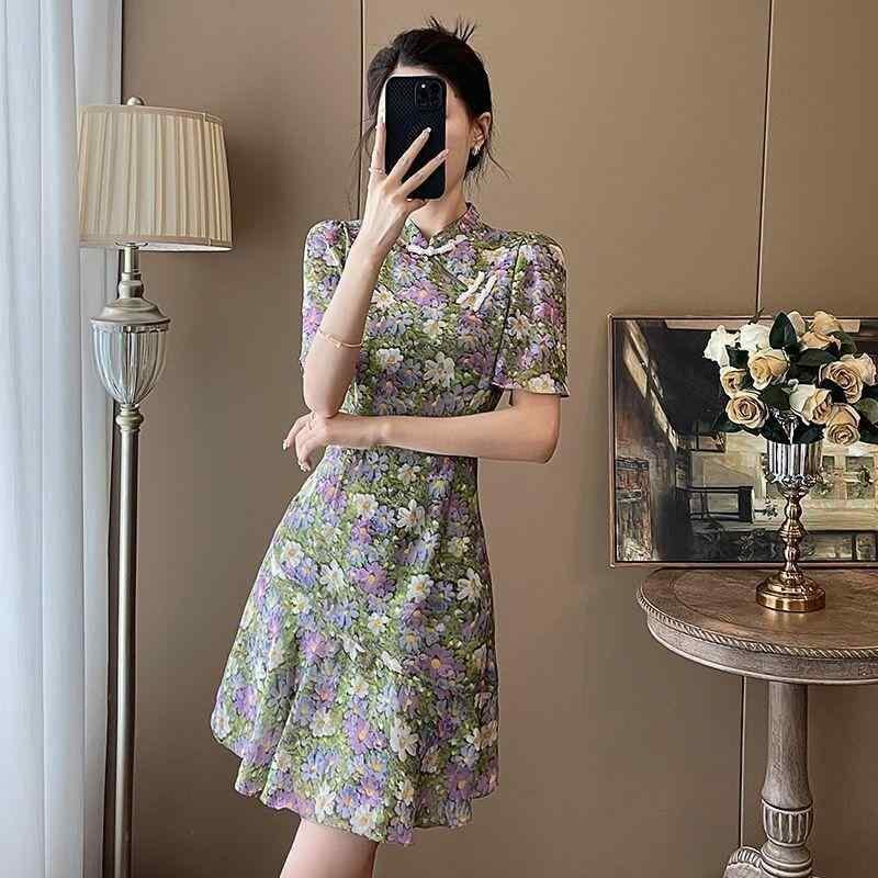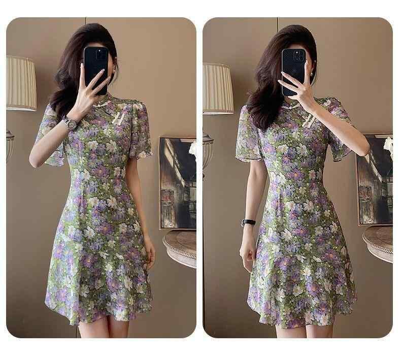 ワンピース レディース プラスサイズ 大きいサイズ 改良チャイナドレス 花柄 プリント 民族風 新中式スタイル 低身長向け 小柄さん向け Aライン ミディ丈 スタンドカラー 半袖 ポリエステル パープル