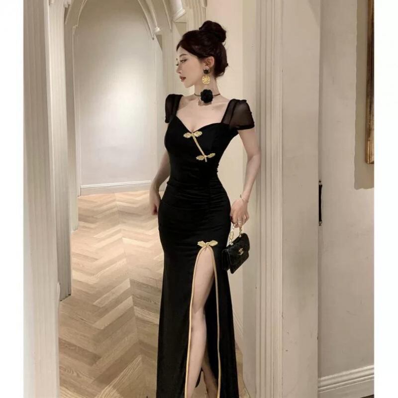 ワンピース レディース 大きいサイズ プラスサイズ エレガント 改良チャイナ風 スリット入り セクシー タイト スリムフィット ボディコン ロングドレス 綿 スクエアネック 半袖 黒 パーティー お呼ばれ デート フォーマル 結婚式 二次会