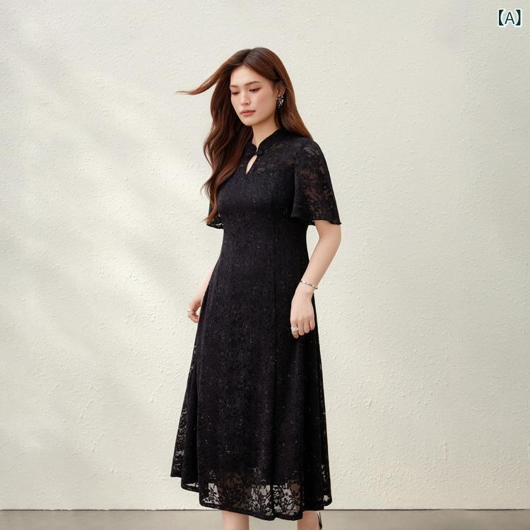 ワンピース レディース 大きいサイズ ぽっちゃりさん向け 新中華風 レース メッシュ チャイナドレス ウエストマーク Aラインスカート スタンドカラー 五分袖 ミモレ丈 ナイロン ブラック アプリコット 上品 綺麗め オフィス 通勤 カジュアル 夏