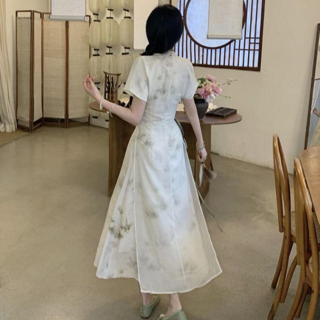 ワンピース レディース 大きいサイズ プラスサイズ 改良型 チャイナドレス 新中華風 エスニック 着痩せ スタイルアップ 上品 エレガント ロングワンピース ポロ襟 ノースリーブ グリーン 緑色 肌を明るく見せる シュニール スパンデックス