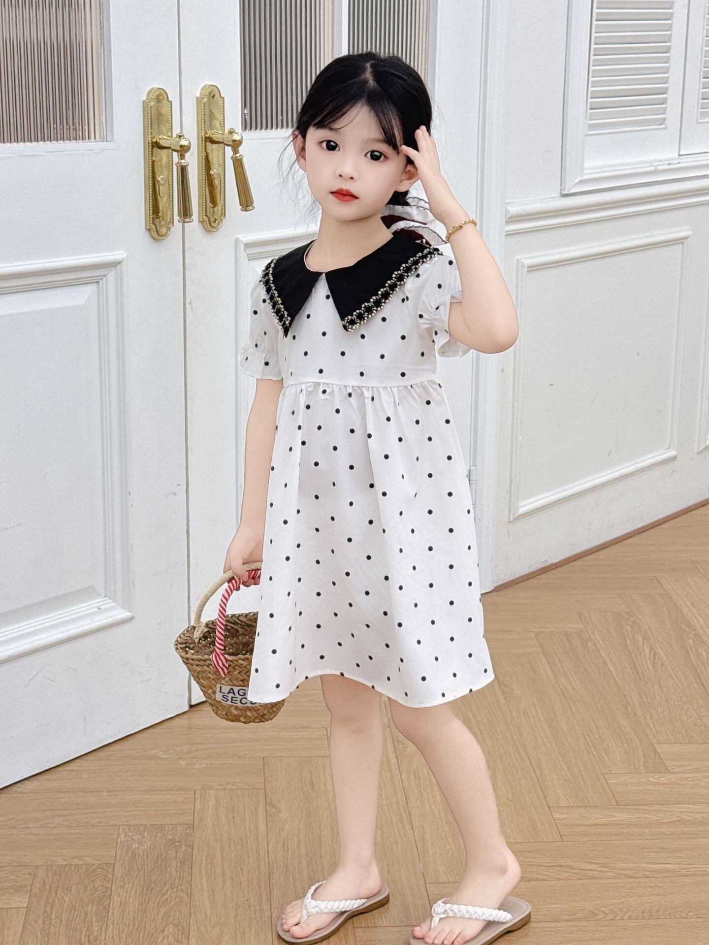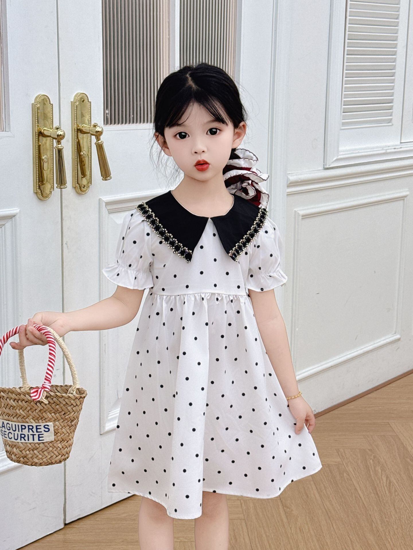 キッズ 女の子 ワンピース 水玉 プリンセス 上品 エレガント おしゃれ カジュアル 夏用 Aライン かわいい ポリエステル ブラック