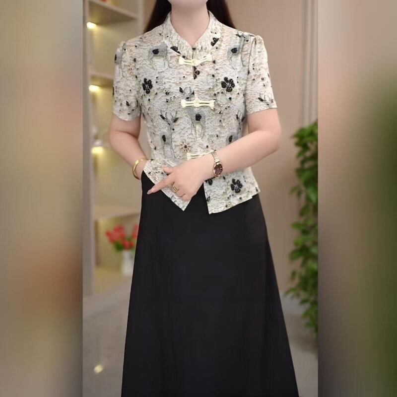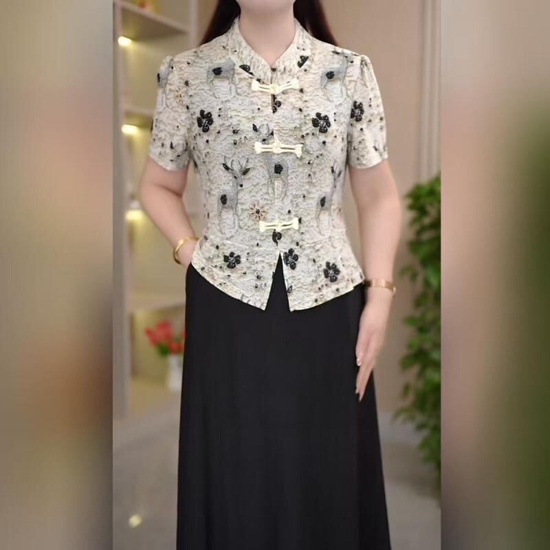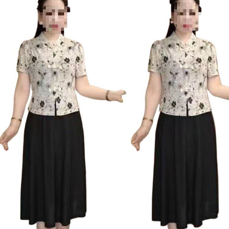 ワンピース ミセス 大きいサイズ 体型カバー 夏 エレガント チャイナ風 スタンドカラー 半袖 切り替え フェイクレイヤード 着痩せ 上品 膝下丈 ミモレ丈 ドレス ベージュ