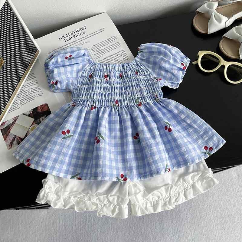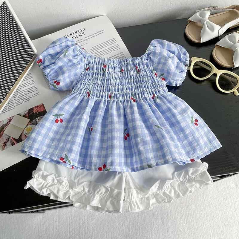 セットアップ 女の子 ベビー キッズ 幼児 1歳 2歳 3歳 韓国風 かわいい おしゃれ ブルー チェック柄 半袖 トップス ショートパンツ 綿 コットン 夏服 普段着 お出かけ 通園 2点セット