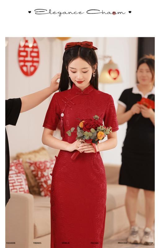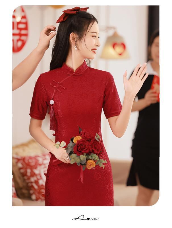 旗袍ワンピース レディース 花嫁 結婚式 披露宴 婚約ドレス お呼ばれ セレモニー フォーマル 中華風 レトロ ヴィンテージ 小柄 低身長向け 高級感 改良版 ワインレッド ミドル丈 ハイネック 半袖 スリット入り