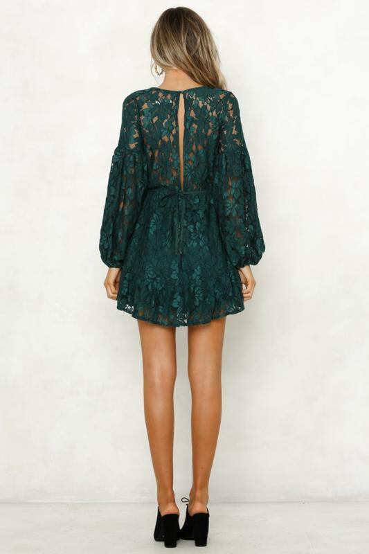 ワンピース レディース ミニ丈 Aライン Vネック ランタンスリーブ 長袖 バックオープン セクシー レース 花柄 ウエストマーク プリーツ 切り替え ポリエステル 都市カジュアル デート パーティー
