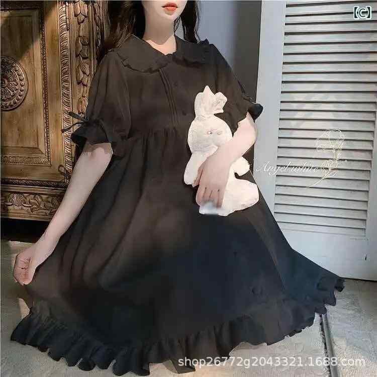 ワンピース レディース ロリータ 甘ロリ 日系 ドールスタイル 付け襟 半袖 パフスリーブ フリル 夏 プリンセスライン フレアスカート ミディ丈 デート イベント アセテート繊維 ホワイト ブラック ピンク