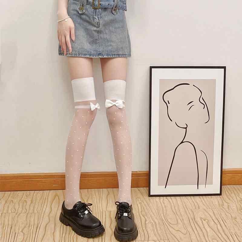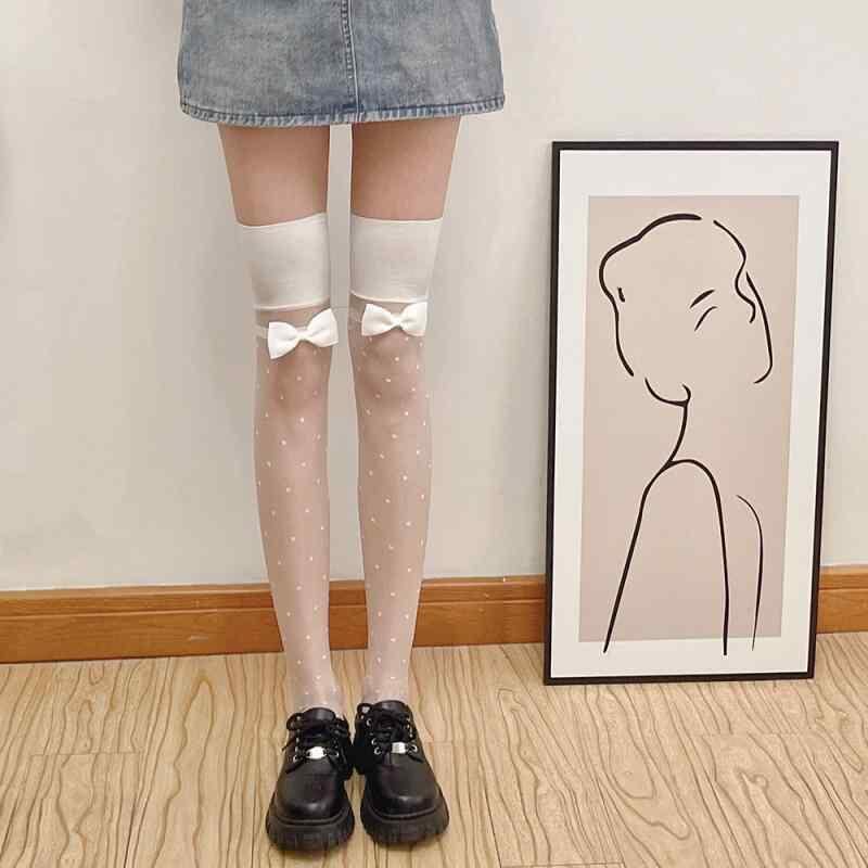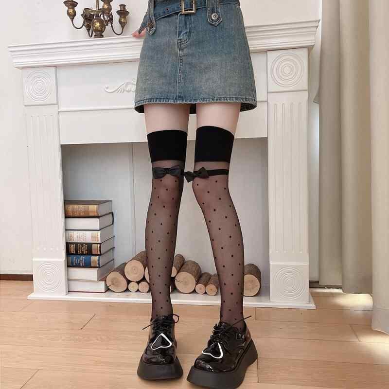 ストッキング レディース 黒 シアー 超薄手 透け感 ドット柄 リボン 蝶々結び ジャガード織り ニーハイソックス オーバーニー ロリータファッション セクシー 美脚効果 ナイトシーン
