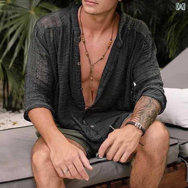 シャツ メンズ 長袖 綿麻 無地 欧米風 ゆったり 快適 トップス 男性用 カジュアル 普段使い リラックススタイル ブラック カーキ 襟付き