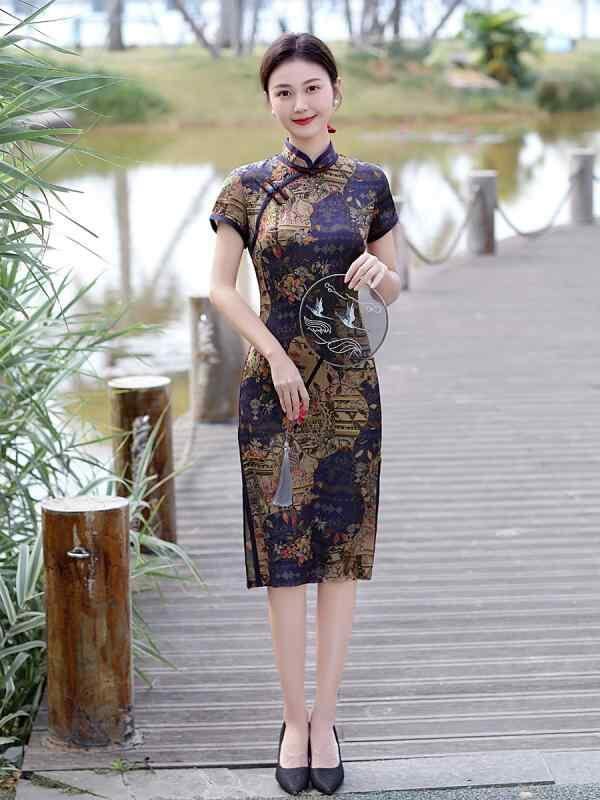 チャイナドレス レディース 普段使い ワンピース 着痩せ ミモレ丈 膝下丈 レトロ柄 タイダイ柄 プリント 大きいサイズ ポリエステル スタンドカラー 七分袖 サイドスリット ストレッチ素材 レッド グリーン ネイビー