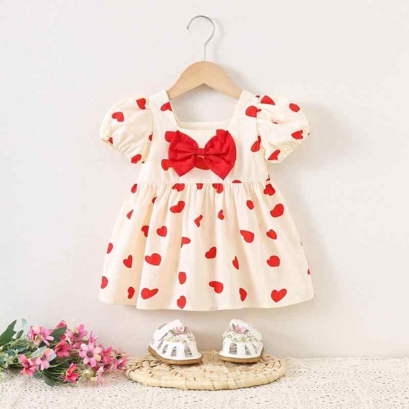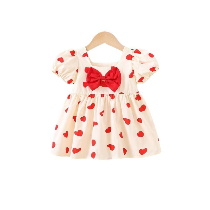 ワンピース ベビー 女の子 子供 幼児 ハート柄 プリント プリンセススタイル ドレス 夏用 綿素材 ポリエステル裏地 フレアスカート 80cm 90cm 100cm 1歳 2歳 3歳 かわいい おしゃれ