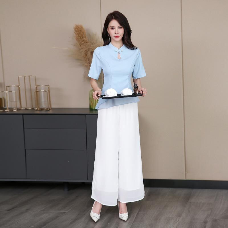 施術着 レディース フットケア 美容 マッサージ 制服 ユニフォーム 半袖 ロングパンツ スタンドカラー 上下セット ポリエステル 酢酸繊維 吸湿速乾 ホテル 旅館 エステ リラクゼーション 整体