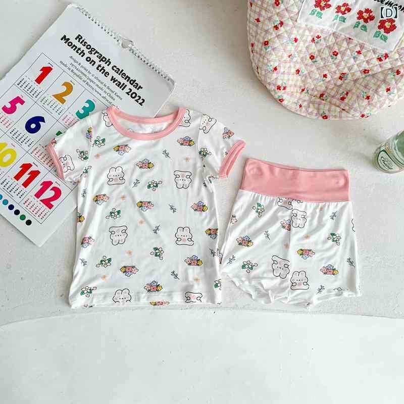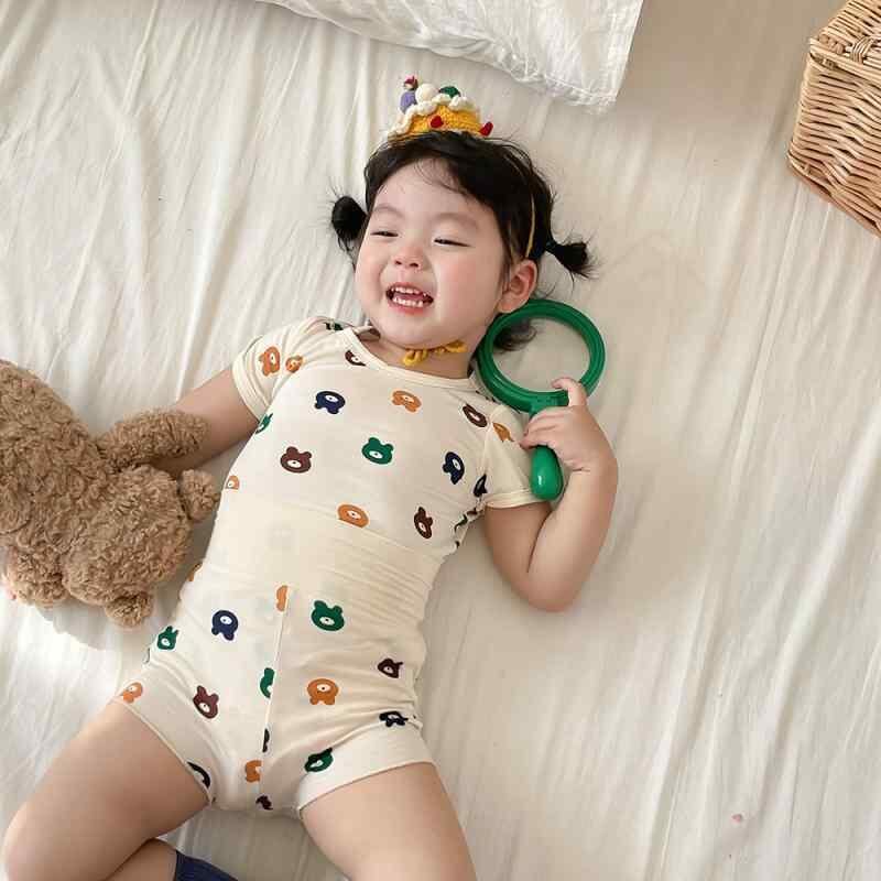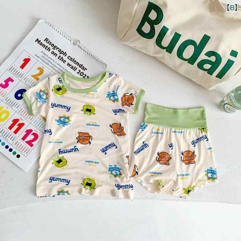 ルームウェア ベビー キッズ 男の子 女の子 パジャマ モーダル 薄手 夏用 部屋着 寝間着 幼児 子供用 ハイウエスト 腹巻き付き 上下セット お腹保護 腹出し防止 柔らかい 肌触り良い アニマル柄 ポップ カラフル かわいい