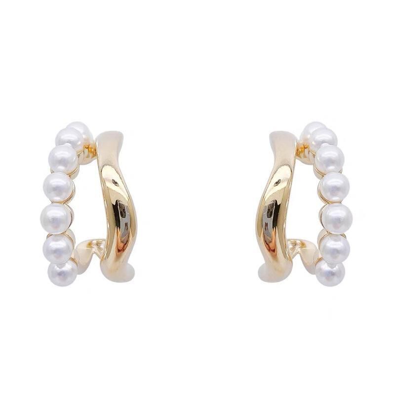 ピアス レディース 925シルバーポスト C字 クロス パール ダブルウェーブ イヤリング 個性的 幾何学デザイン 軽やかな高級感 エレガント 上品 韓国風 普段使い オフィス デート カジュアル ゴールド アクセサリー