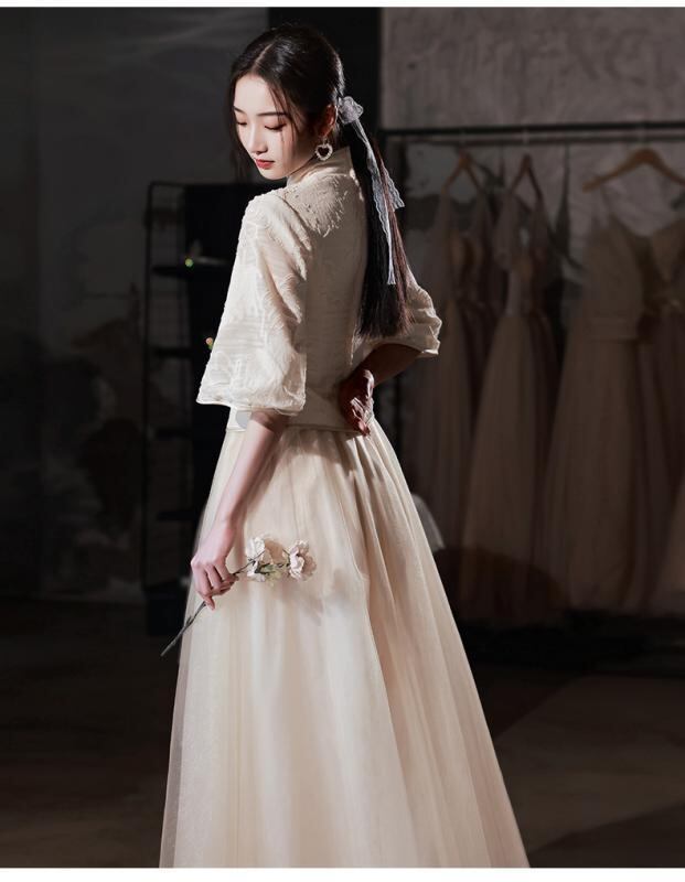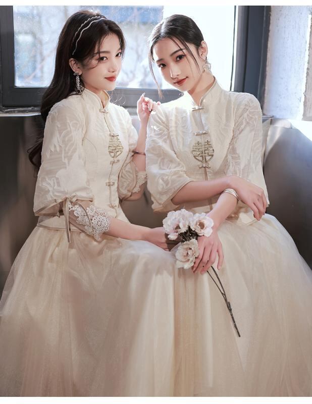 ドレス レディース シャンパンカラー チャイナドレス 中華風 フォーマル ロング丈 Aライン 立襟 長袖 結婚式 ブライズメイド 披露宴 二次会 お呼ばれ パーティー 演奏会 発表会 成人式 食事会 刺繍 低身長 小柄