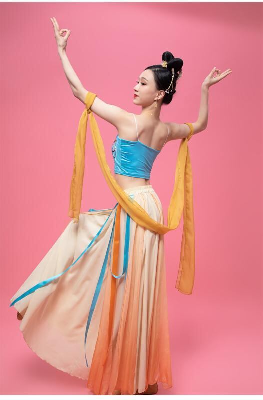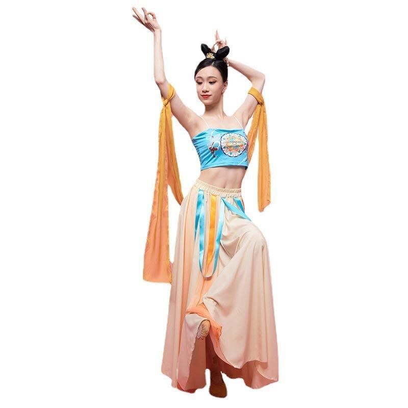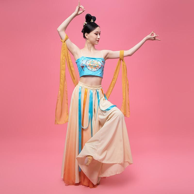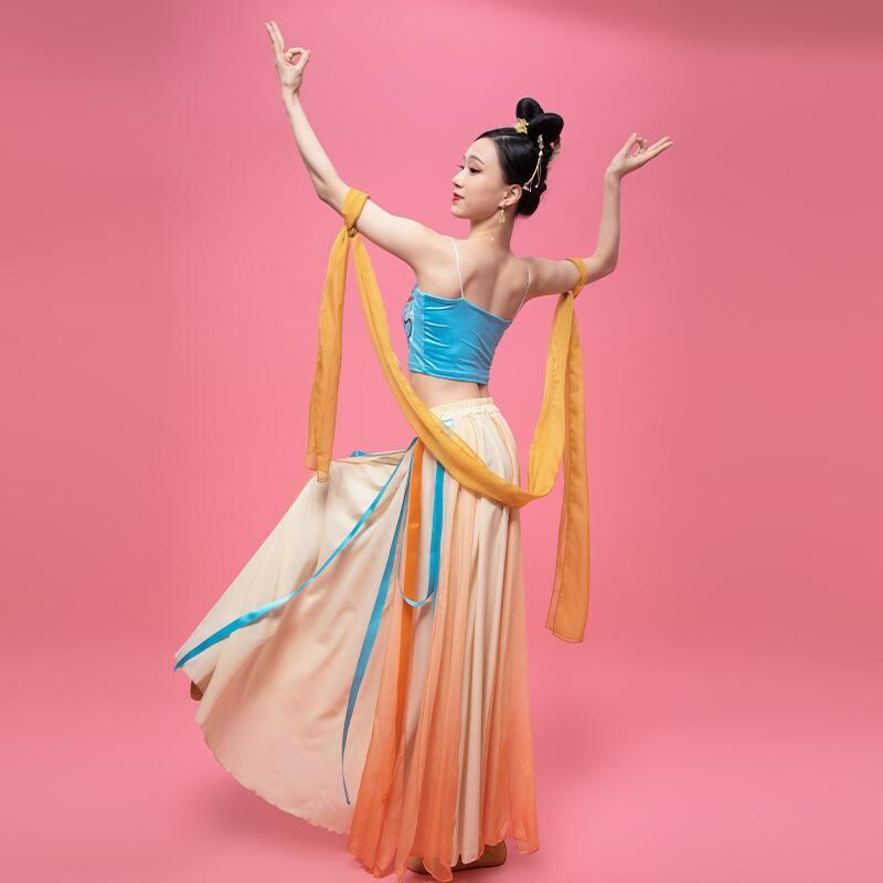 古典舞踊 衣装 レディース 敦煌 飛天 プリント ベアトップ スカーフ付き イエロー グラデーション 広がるフレアスカート 接触冷感素材 テンセル 伸縮性